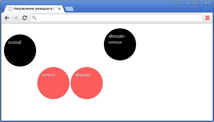 <!DOCTYPE html> <html> <head> <title>Направление анимации в CSS</title> <style> div { width: 75px; /* устанавливаем ширину блока */ height: 75px; /* устанавливаем высоту блока */ border-radius: 60px; /* определяем форму углов элемента */ display : inline-block; /* устанавливаем элементы <div> как блочно-строчные (выстраиваем в линейку) */ color : white; /* устанавливаем цвет шрифта белый */ padding : 15px; /* устанавливаем внутренние отступы элемента со всех сторон */ position: relative; /* элемент с относительным позиционированием */ animation-duration: 1.5s; /* задаём продолжительность анимации 1,5 секунды */ animation-name: iliketomoveit; /* задаём имя анимации (соответствует имени назначенному в ключевых кадрах) */ animation-iteration-count: infinite; /* указываем, что анимация будет повторяться бесконечно */ } .test { animation-direction: normal; /* при завершении цикла анимации, анимация сбрасывается в начало и начинает цикл заново. */ } .test2 { animation-direction: reverse; /* анимация воспроизводиться в обратном направлении */ } .test3 { animation-direction: alternate; /* анимация воспроизводиться как normal каждый нечетный раз (1, 3, 5...) и как reverse каждый четный раз (2, 4, 6...) */ } .test4 { animation-direction: alternate-reverse; /* анимация воспроизводиться как reverse каждый нечетный раз (1, 3, 5...) и как normal каждый четный раз (2, 4, 6...) */ } @keyframes iliketomoveit { 0% {top: 0px;} 25% {top: 180px; background: red;} 75% {top: 90px;} 100% {top: 0px; background: black;} } </style> </head> <body> <div class = "test">normal</div> <div class = "test2">reverse</div> <div class = "test3">alternate</div> <div class = "test4">alternate-reverse</div> </body> </html>