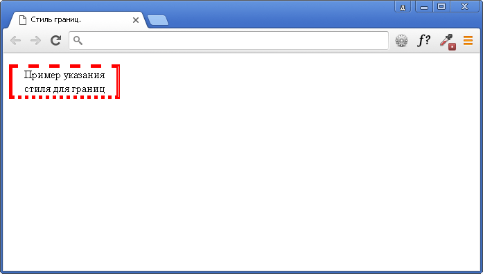<!DOCTYPE html> <html> <head> <title>Стиль границ.</title> <style> .primer { border :5px red; /* задаём ширину всех границ 5px и цвет - красный */ border-bottom-style :dotted; /* задаём для нижней границы точечный стиль */ border-left-style :solid; /* задаём для левой границы сплошной стиль */ border-right-style:double; /* задаём для правой границы двойной стиль */ border-top-style:dashed; /* задаём для верхней границы пунктирный стиль */ text-align:center; /* задаём выравнивание текста по центру */ width:150px; /* задаём ширину блока */ } </style> </head> <body> <p class = "primer">Пример указания стиля для границ</p> </body> </html>