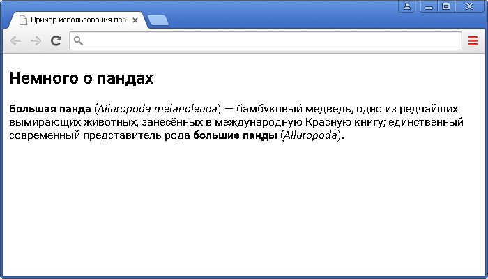 <!DOCTYPE html> <html> <head> <title>Пример использования правила @font-face</title> <style> @font-face { font-family : "Roboto"; /* задаем произвольное имя для шрифта, которое будет использоваться в свойстве font-family при указании стилей для конкретных элементов */ src : url("../../fonts/Roboto-Regular.ttf") format('ttf'); /* задаем путь к шрифту (url) и тип шрифта (format). Тип шрифта выступает подсказкой для браузера (в идеале ускоряет процесс обработки) */ font-style : normal; /* указываем, что стиль шрифта обычный - это значение по умолчанию */ font-weight : normal; /* определяет нормальное начертание символов - это значение по умолчанию */ } @font-face { font-family : "Roboto"; /* задаем произвольное имя для шрифта, которое будет использоваться в свойстве font-family при указании стилей для конкретных элементов */ /* для упрощения работы со шрифтами допускается использовать одинаковое имя, но при этом начертание или стиль шрифта должен отличаться. IE 8 и ниже не поддерживают такой подход и если Вы хотите поддерживать эти браузеры, то Вам необходимо называть каждый шрифт по разному и более детально стилизовать каждый селектор */ src : url("../../fonts/Roboto-Bold.ttf") format('truetype'); /* задаем путь к шрифту (url) и тип шрифта (format). Тип шрифта выступает подсказкой для браузера (в идеале ускоряет процесс обработки) */ font-style : normal; /* указываем, что стиль шрифта обычный - это значение по умолчанию */ font-weight : bold; /* определяет жирное начертание символов */ } @font-face { font-family : "Roboto"; /* задаем произвольное имя для шрифта, которое будет использоваться в свойстве font-family при указании стилей для конкретных элементов */ src : url("../../fonts/Roboto-Italic.ttf") format('truetype'); /* задаем путь к шрифту (url) и тип шрифта (format). Тип шрифта выступает подсказкой для браузера (в идеале ускоряет процесс обработки) */ font-style : italic; /* указываем, что стиль шрифта курсивный */ font-weight : normal; /* определяет нормальное начертание символов - это значение по умолчанию */ } h2, p, b, i { /* задаем групповой селектор для элементов <h2>, <p>, <b>, <i> */ font-family : "Roboto", sans-serif; /* устанавливаем шрифт Roboto, если он не будет загружен по какой-то причине, то указываем, чтобы браузер установил шрифт из семейства шрифтов без засечек (sans-serif) */ } </style> </head> <body> <h2>Немного о пандах</h3> <p><b>Большая панда</b> (<i>Ailuropoda melanoleuca</i>) — бамбуковый медведь, одно из редчайших вымирающих животных, занесённых в международную Красную книгу; единственный современный представитель рода <b>большие панды</b> (<i>Ailuropoda</i>).</p> </body> </html>