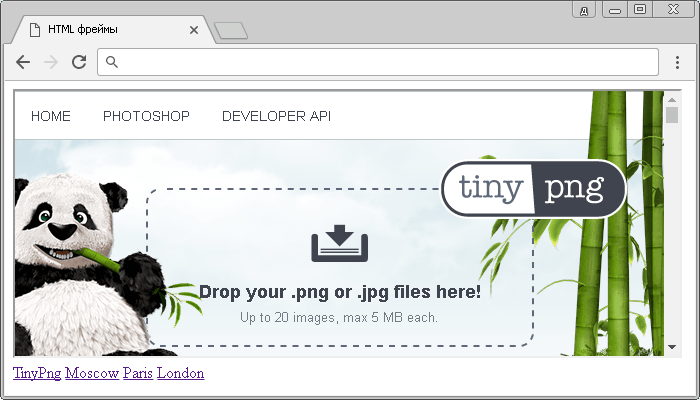 В следующем примере мы возьмем в качестве загрузки во фрейм отличный сайт - TinyPng.com, который предоставляет возможность сжимать изображения, предназначенные к загрузке на Ваш сайт. Как правило, удаётся уменьшить размер изображений на 50%, а то и больше, что значительно уменьшает их объем, экономит дисковое пространство и увеличивает скорость загрузки страниц.