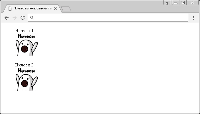 <!DOCTYPE html> <html> <head> <title>Пример использования тега <figure></title> </head> <body> <main> <figure> <img src = "10.jpg" alt = "ничоси" width = "80" height = "80"> <figcaption>Ничоси 1</figcaption> </figure> <figure> <img src = "10.jpg" alt = "ничоси" width = "80" height = "80"> <figcaption>Ничоси 2</figcaption> </figure> </main> </body> </html>