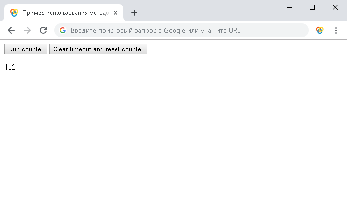 <!DOCTYPE html> <html> <head> <title>Использование JavaScript методов setInterval() и clearInterval() объекта WindowOrWorkerGlobalScope</title> </head> <body> <button onclick = "runCounter()">Run counter</button> <!-- добавляем атрибут событий onclick --> <button onclick = "clearMyTimeOut()">Clear timeout and reset counter</button> <!-- добавляем атрибут событий onclick --> <span id = "counter">0</span> <script> let timeoutID; // создаем пустую переменную let counter = 0; // инициализируем переменную числовым значением function showCounter() { counter++; // инкрементируем значение переменной document.getElementById("counter").innerHTML = counter; // находим элемент по id и изменяем его содержимое значением переменной } function clearMyTimeOut() { clearInterval(timeoutID); // отменяем повторяющееся выполнение программного кода, которое было ранее установлено вызовом метода setInterval() counter = 0; // присваиваем значение переменной document.getElementById("counter").innerHTML = counter; // находим элемент по id и изменяем его содержимое значением переменной } function runCounter() { timeoutID = setInterval(showCounter, 1000); // задаем таймер, который многократно выполняет функцию каждые 1000 миллисекунд (1 секунда) } </script> </body> </html>