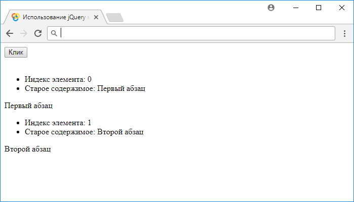 <!DOCTYPE html> <html> <head> <title>Использование jQuery метода .prepend() (функция в качестве параметра)</title> <script src = "https://ajax.googleapis.com/ajax/libs/jquery/3.1.0/jquery.min.js"></script> <script> $( document ).ready(function(){ $( "button" ).click(function(){ // задаем функцию при нажатиии на элемент <button> $( "p" ).prepend(function ( index, html ) { // передаем функцию в качестве параметра метода return "<ul><li>Индекс элемента: " + index + "</li><li>Старое содержимое: " + html + "</li></ul>"; // добавляем список в начало элемента, который содержит информацию о индексе элемента в наборе и его содержимое }); }); }); </script> </head> <body> <button>Клик</button><br><br> <p>Первый абзац</p> <p>Второй абзац</p> </body> </html>