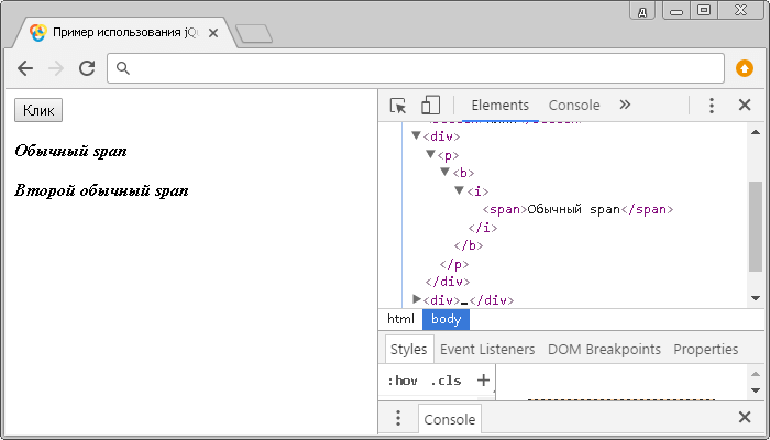 <!DOCTYPE html> <html> <head> <title>Использование jQuery метода .wrap() (обертывание несколькими HTML элементами)</title> <script src = "https://ajax.googleapis.com/ajax/libs/jquery/3.1.0/jquery.min.js"></script> <script> $( document ).ready(function(){ $( "button" ).click(function(){ // задаем функцию при нажатиии на элемент <button> $( "span" ).wrap('<div><p><b><i></i></b></p></div>'); // обертываем каждый элемент <span> в документе }); }); </script> </head> <body> <button>Клик</button> <span>Обычный span</span> <span>Второй обычный span</span> </body> </html>