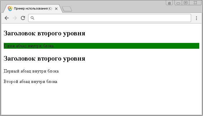 <!DOCTYPE html> <html> <head> <title>Использование jQuery селектора :only-of-type</title> <script src = "https://ajax.googleapis.com/ajax/libs/jquery/3.1.0/jquery.min.js"></script> <script> $(document).ready(function(){ $("p:only-of-type").css("background-color", "yellow"); // выбираем все элементы <p> в документе, которые являются единственными дочерними элементами определённого типа внутри своего родительского элемента. }); </script> </head> <body> <div> <h2>Заголовок второго уровня</h2> <p>Один абзац внутри блока</p> </div> <div> <h2>Заголовок второго уровня</h2> <p>Первый абзац внутри блока</p> <p>Второй абзац внутри блока</p> </div> </body> </html>